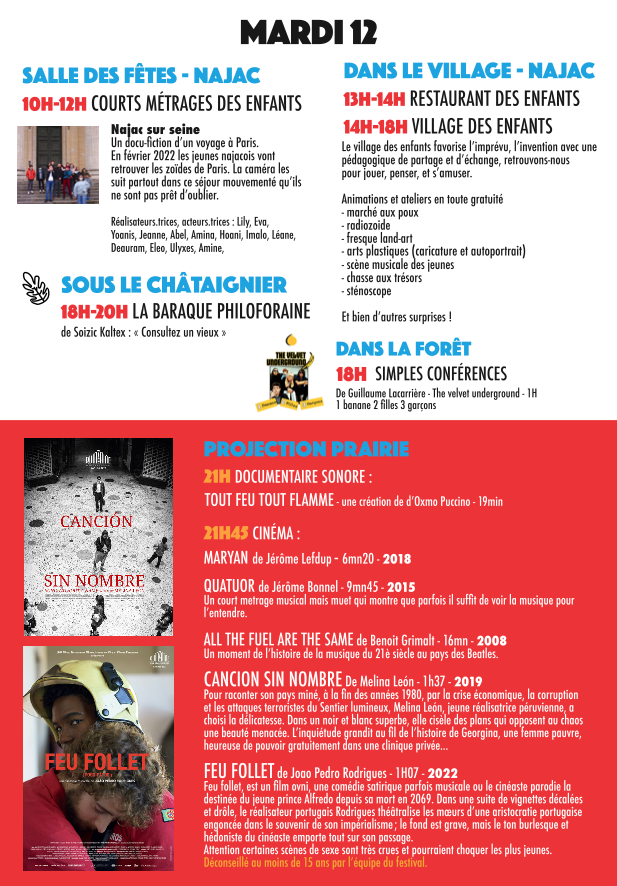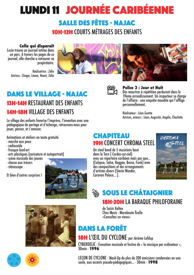 Mais rassurez-vous, il y a les projections des films des enfants dès 11H00, et à partir de 14H00 des ateliers de films d’animations à la salle des fêtes de NAJAC.