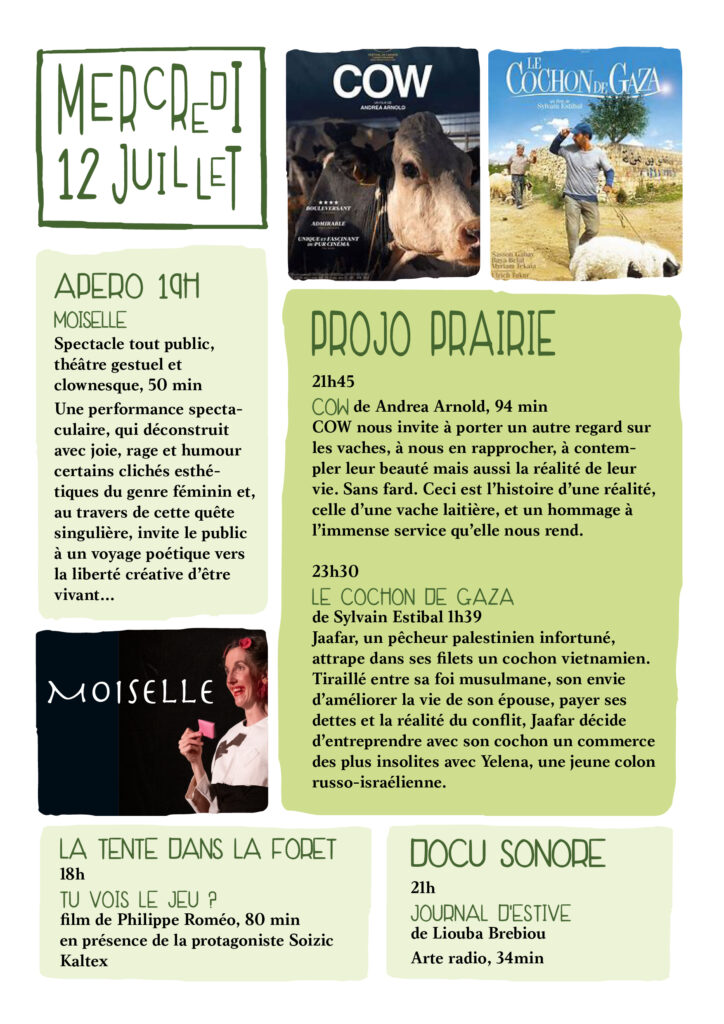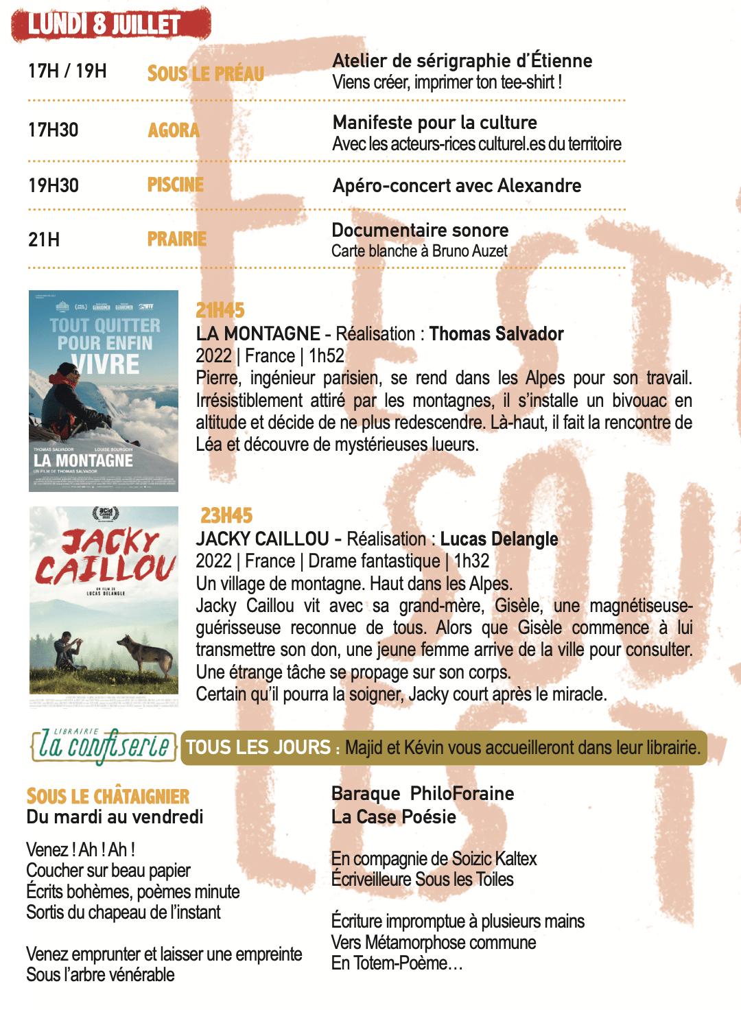 Aujourd’hui, le cafézoide dans le village, un apéro concert, et des courts métrages réalisés par les enfants suivi d’un film.